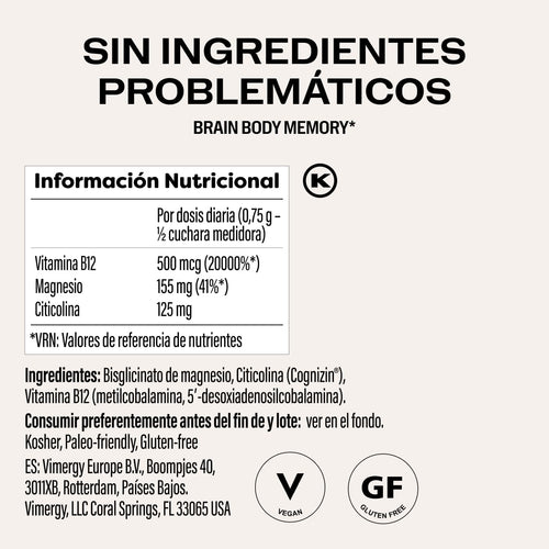 - COMBINA 3 INGREDIENTES BIOACTIVOS: Contiene magnesio bioactivo, B12 y citicolina, todos clínicamente estudiados por sus propiedades para el rendimiento cerebral.