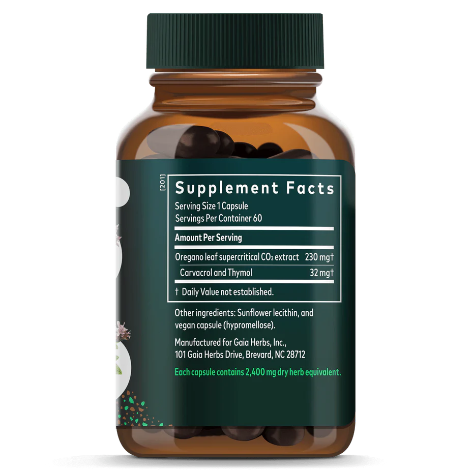 Estratto supercritico di foglie di origano con CO2: 230 mg, carvacrolo e timolo: 32 mg. Lecitina di girasole e capsula vegana (ipromellosa).